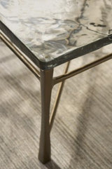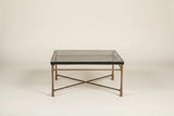 The Cirrus Cocktail Table is a square, modern centerpiece featuring a cast glass top and an Antique Brass cast aluminum base. This piece is rated for covered outdoor areas, combining a sophisticated look with robust durability.