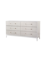 A light and airy addition to any bedroom, the Brentwood Dresser features Alabaster finished drawer fronts with champagne and acrylic bar hardware, six spacious drawers, and a gleaming white lacquer case.