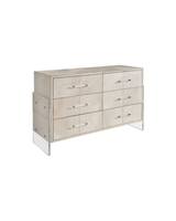 The Lyra Six Drawer Dresser is a beacon of modern glamour, featuring a luxurious gray hair-on-hide finish across its six drawers. This piece is adorned with a striking combination of polished nickel and acrylic hardware, enhancing its contemporary allure. The dresser stands on gorgeous geometric acrylic panel legs, adding an architectural element that further defines its sophisticated and cutting-edge aesthetic.