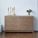 The Ming Collection 6 drawer dresser is very tailored in finish and design. Handsome details include: a slender frame, soft corners, graduated sides that narrow toward the top, Chow-style feet, textured lacquered grasscloth and brass pulls.