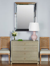 The Ming Collection 4 drawer chest is very tailored in finish and design. Handsome details include: a slender frame, soft corners, graduated sides that narrow toward the top, Chow-style feet, textured lacquered grasscloth and brass pulls.