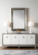 The Melinda Mirror features a simple rectangular frame embellished with a hand-hammered, dimpled pattern. Each one is made by a master craftsman and bears the distinctive and unique hand of its maker.