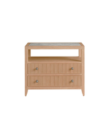 The Carmen Two-Drawer Nightstand is a stylish and functional addition to any bedroom. Its two spacious drawers, adorned with sleek metal ring pulls, offer ample storage for bedside essentials. The open shelf, accented by an inset stone top, adds a touch of luxury and provides a convenient space for displaying books or decorative objects.