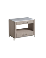 The Soren Bedside Table is a gorgeous marriage of texture and materials, featuring a stone top, sleek bar hardware and a metal base. It includes two spacious drawers and one open-air display shelf.